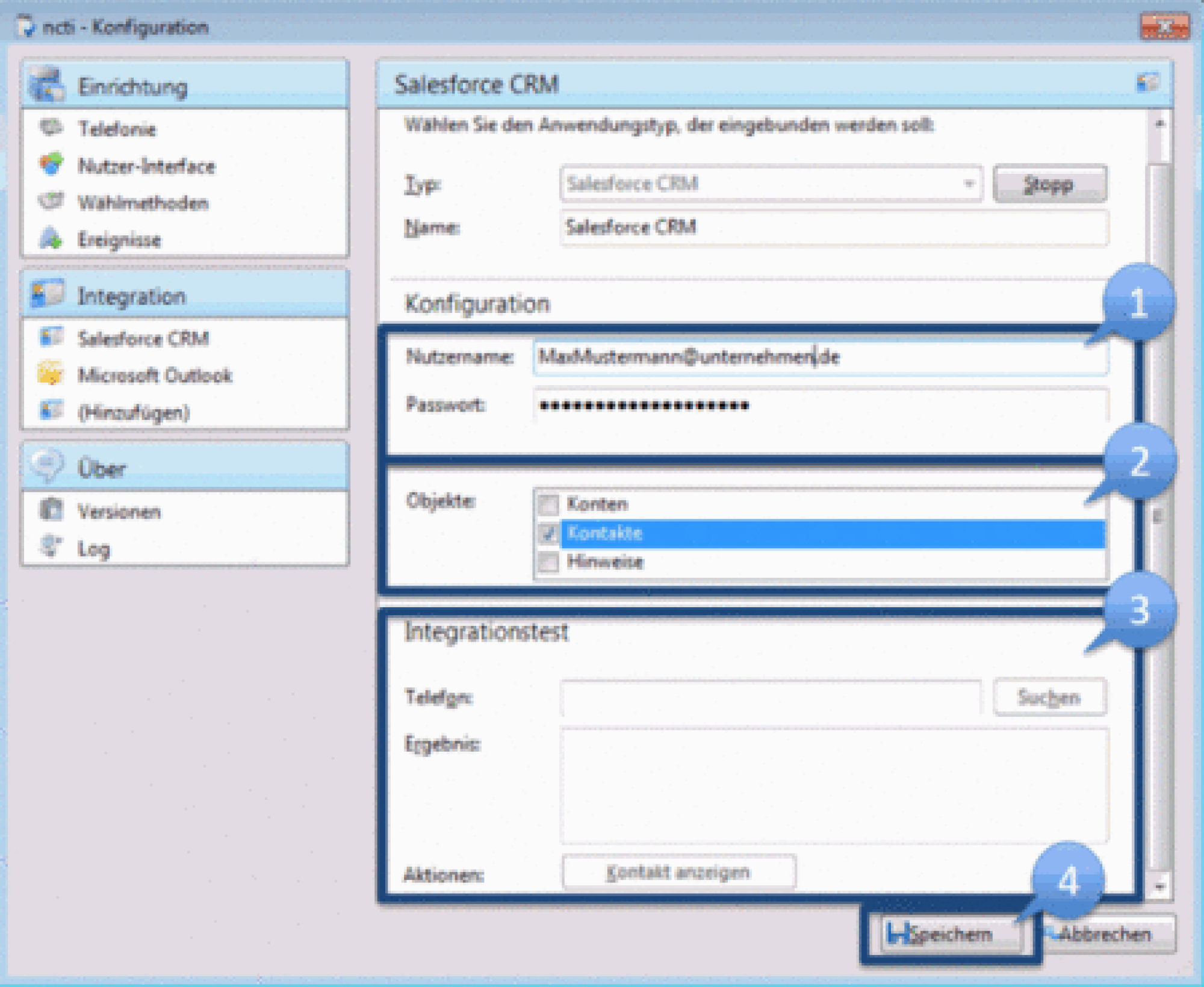 Anschließend müssen Sie die Salesforce-Integration konfigurieren. Befolgen Sie dafür Schritte 1 – 4 auf dem Screenshot.