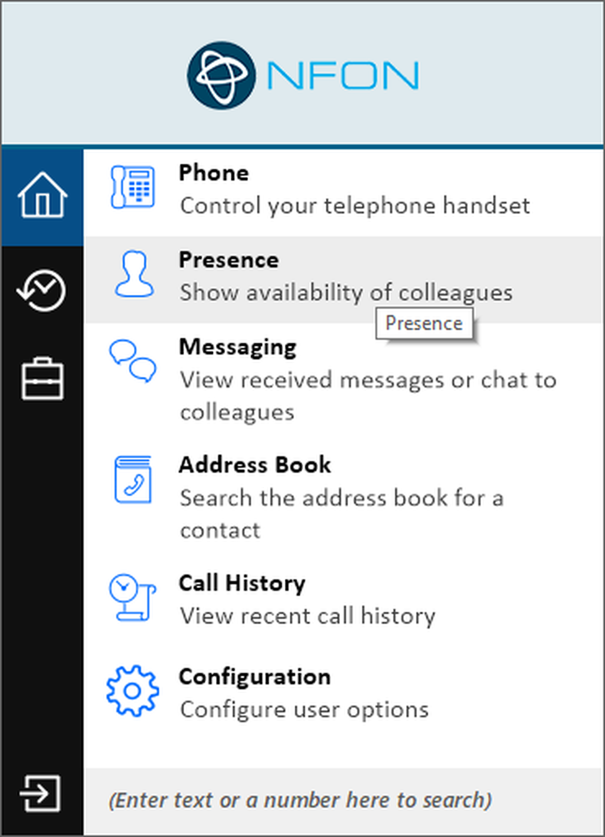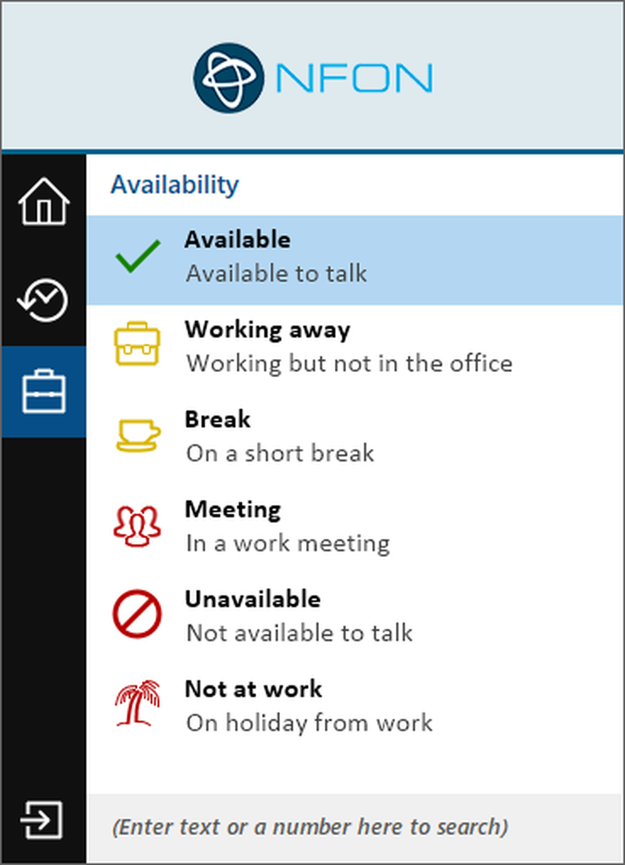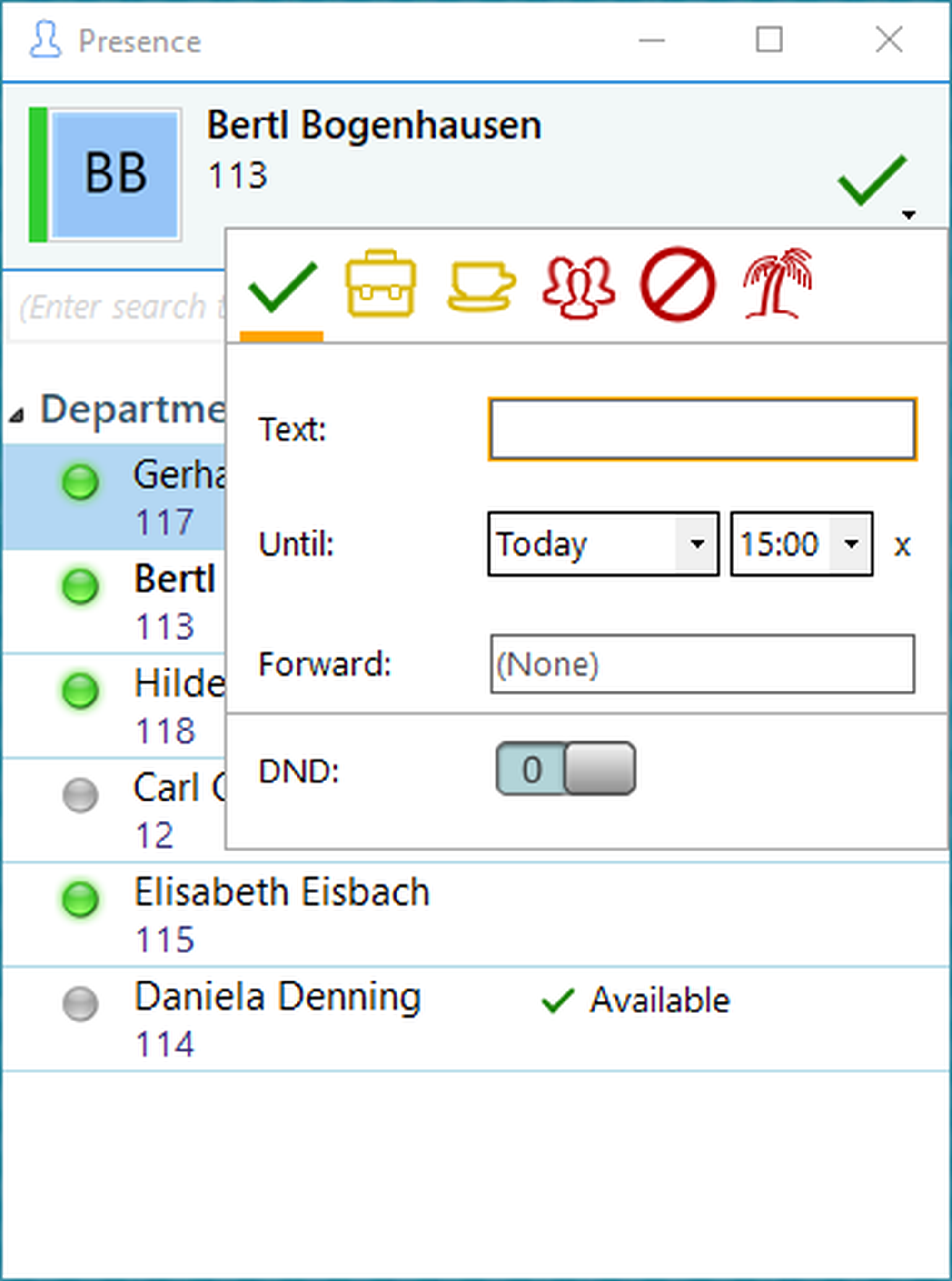 Here you have the possibility to manage the presence information that your colleagues will see. Use this when you are in a meeting and want to avoid unwanted internal calls.