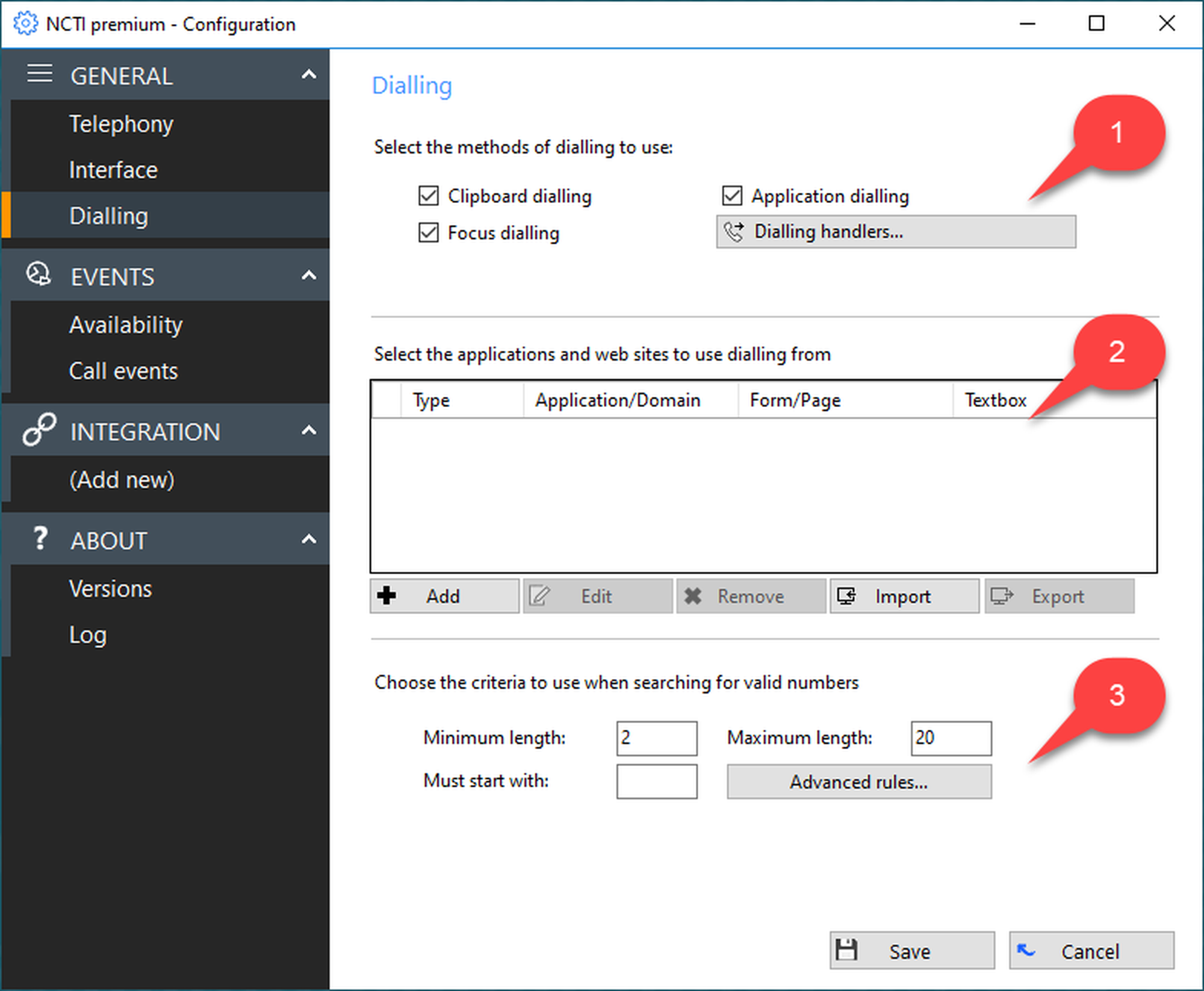 | Telephone | Enter a telephone number to start an integration test. If successful, information will be displayed in the lower field. |