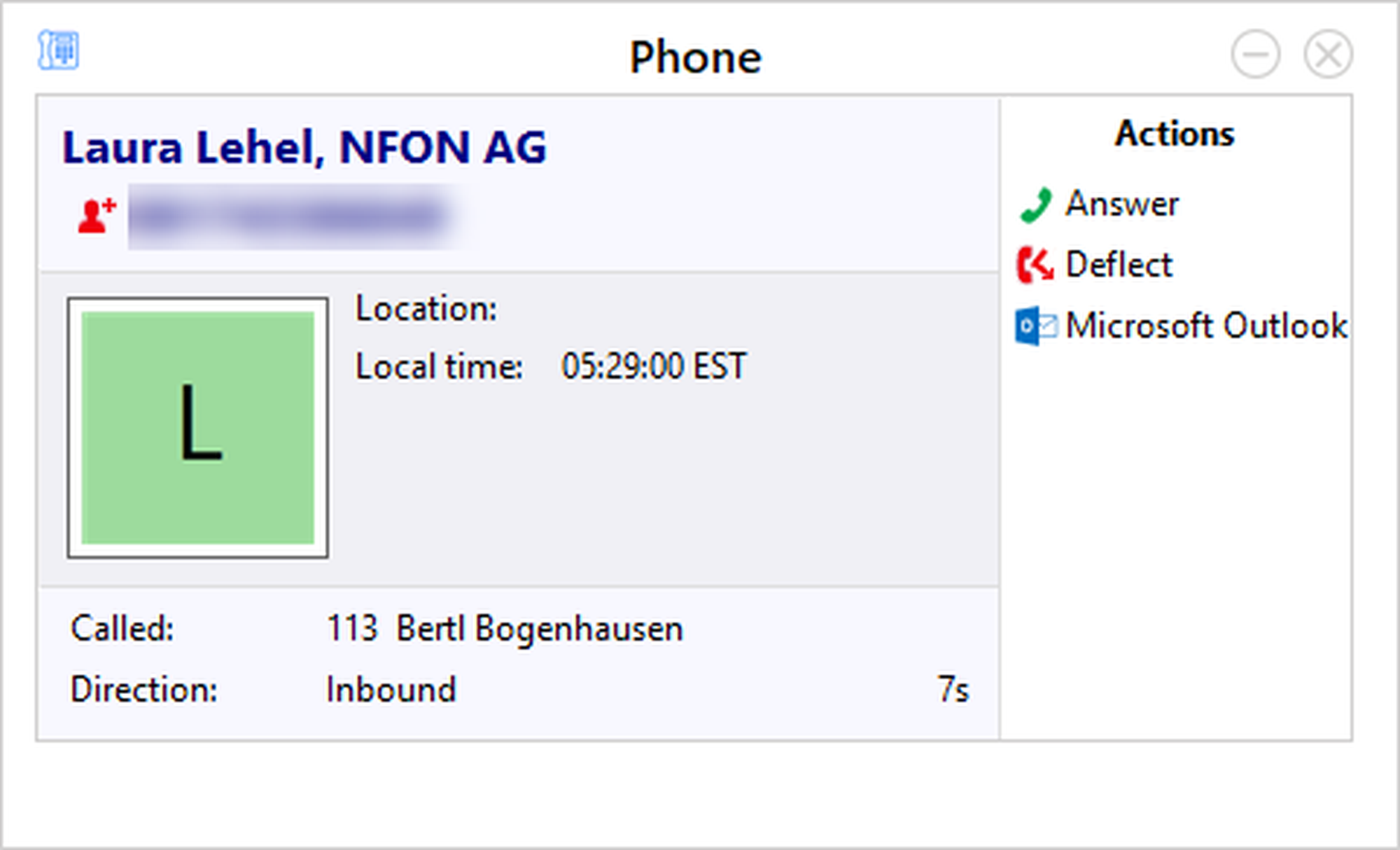 If a contact from your Outlook adress book is calling you, the contact details will be shown in a pop up as soon as the call is initiated. Furthermore, the data is displayed in the telephone window.